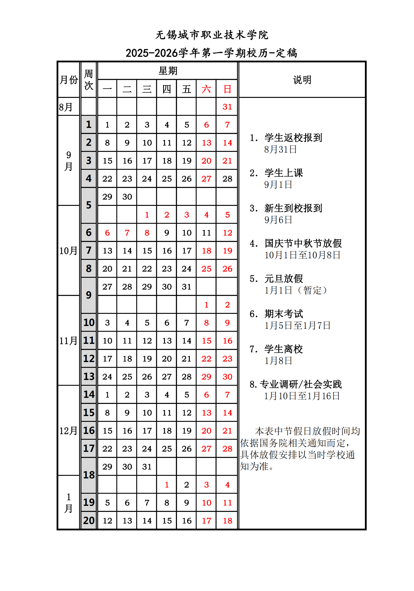 无锡城市职业技术学院2025-2026学年第一学期校历