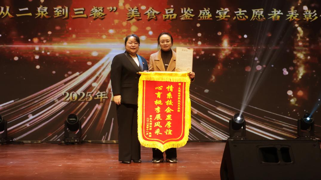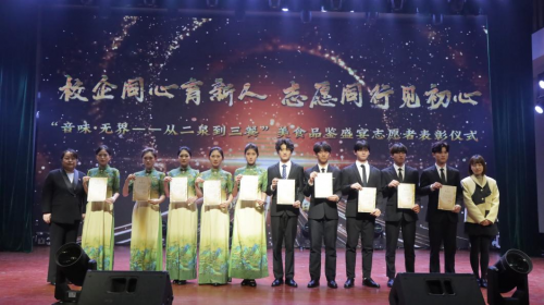 晚会期间,“校企同心育新人 志愿同行见初心”志愿者表彰仪式同步举行,无锡太湖饭店人力资源部经理钱叶与人事经理陈佳乐对在高端文化盛事志愿服务中锤炼专业技能、践行礼仪素养、展现旅院风采的优秀学生志愿者进行表彰,彰显了校企共育人才的初心,为深化校企合作注入动力。